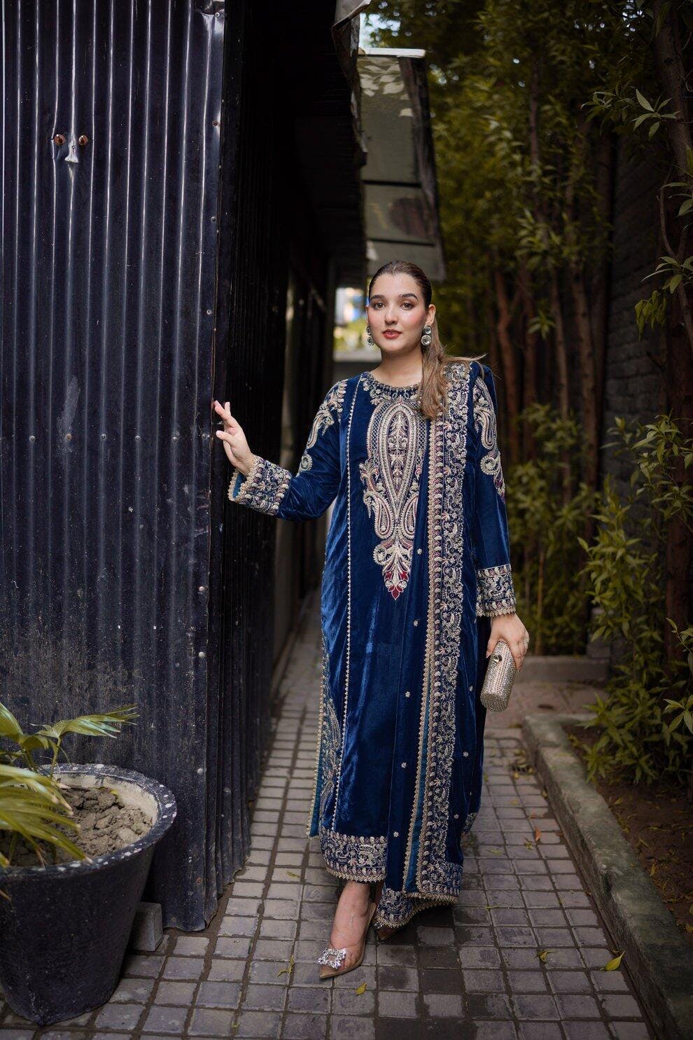 This ready-to-wear 3-piece velvet suit in blue is perfect for any formal occasion. It includes a velvet front, velvet shawl, and satin silk trousers. Luxurious, stylish, and ready to wear right out of the box.